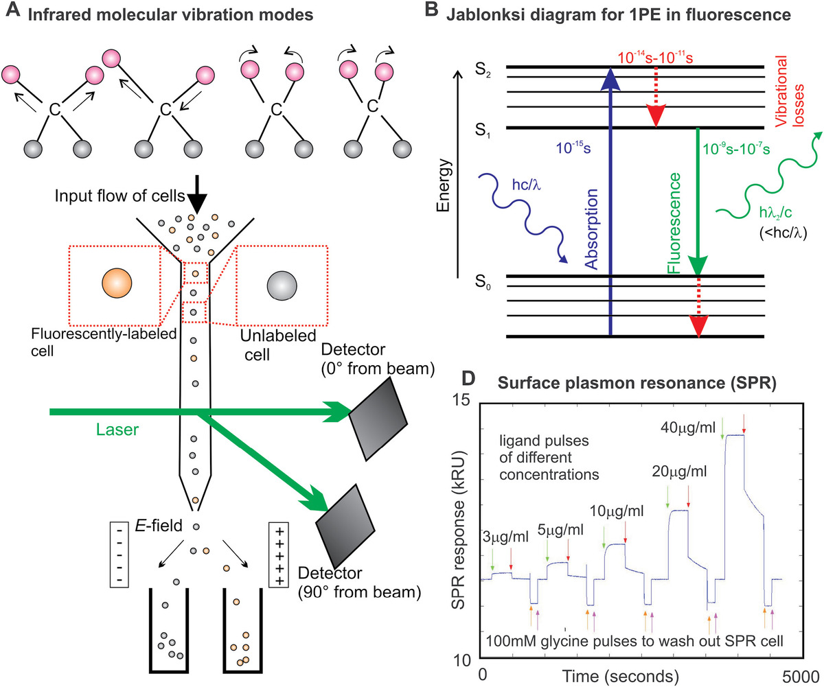 Figure 3.1 Simple spectroscopy and fluorescence excitation. (a) Some typical vibrational modes of a carbon atom–centered molecular motif that are excited by infrared absorption. (b) Jablonski energy level transition diagram for single-photon excitation resulting in fluorescence photon emission, characteristic time scales indicated. (c) Schematic of a typical fluorescence-assisted cell sorting device. (d) Typical output response from an SPR device showing injection events of a particular ligand, followed by washes and subsequent ligand injections into the SPR chamber of increasing concentration.