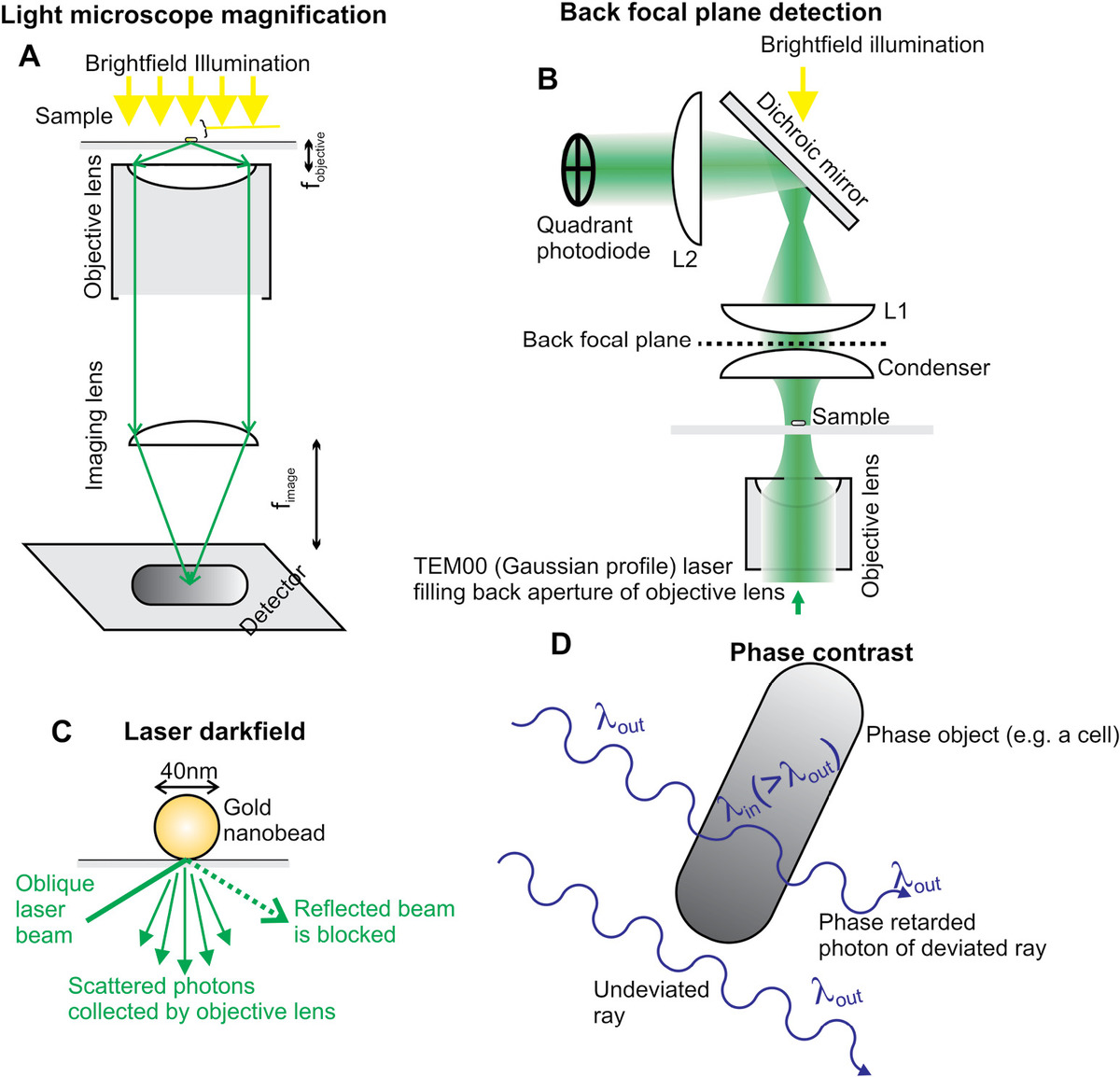 Figure 3.2 Light microscopy methods. (a) Magnification in the simplest two-lens light microscope. (b) Back focal plane detection (magnification onto quadrant photodiode is f2/f1 where fn is the corresponding focal length of lens Ln). (c) Laser dark field. (d) Phase retardation of light through a cell sample in phase contrast microscopy.