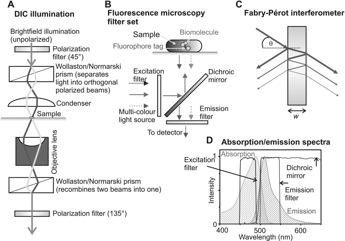 There are two principal bulk in vitro sample optical interferometry techniques: dual polarization interferometry (DPI) and surface plasmon resonance (SPR). In DPI, a reference laser beam is guided through an optically transparent sample support, while a sensing beam is directed through the support at an oblique angle to the surface. This steep angle of incidence causes the beam to be totally internally reflected from the surface, with a by-product of generating an evanescent field into the sample, generally solvated by water for the case of biophysical investigations, with a characteristic depth of penetration of ~100 nm. This is an identical process to the generation of an evanescent field for total internal reflection fluorescence (TIRF) microscopy, which is discussed later in this chapter. Small quantities of material from the sample that bind to the surface have subtle but measureable effects upon polarization in this evanescent field. These can be detected with high sensitivity by measuring the interference pattern of the light that results between sensing and reference beams. DPI gives information concerning the thickness of the surface-adsorbed material and its refractive index.