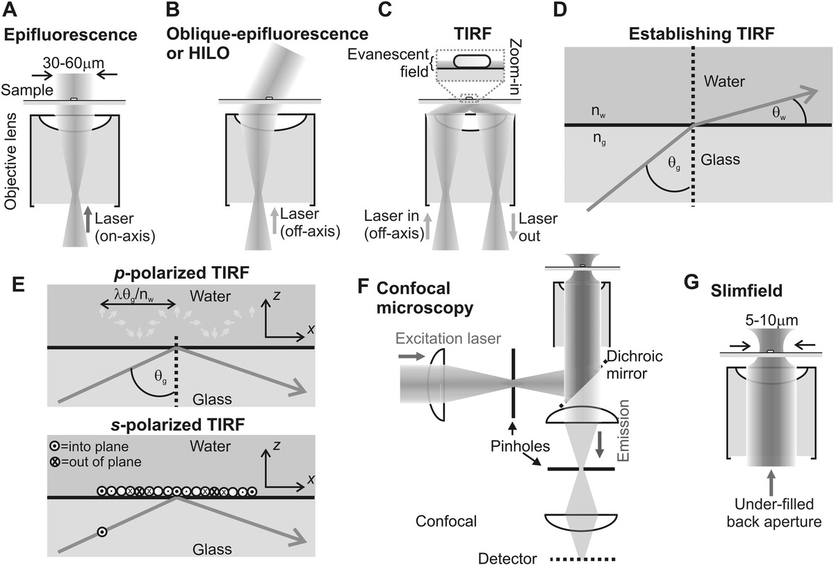 Figure 3.5 Different fluorescence illumination modes. (a) Wide-field epifluorescence using laser excitation. (b) Oblique epifluorescence or highly inclined and laminated optical sheet illumination. (c) Total internal reflection fluorescence (TIRF) using the objective lens method. (d) Schematic for refraction of a laser beam incident on a glass–water interface. (e) The E-field polarization vectors in the TIRF evanescent field generated during (A) p-TIRF excitation (incident polarization vector shown by small light-shaded arrow is in the plane of the page and the evanescent field polarization cartwheels across the surface) and (B) s-TIRF excitation (the incident polarization vector shown by small circle is into the plane of the page, and the axis of this polarization vector in the evanescent field remains parallel to this incident polarization, that is, conserved, though the polarization vector will also periodically extend both into and out of the plane of the page). (f) Confocal microscope schematic arrangement. (g) Slimfield illumination.