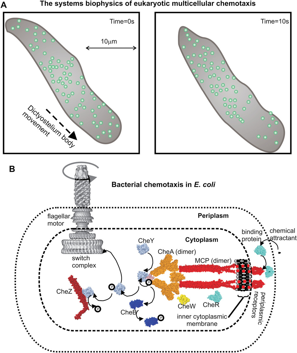 Figure 9.1 Systems biophysics of cell chemotaxis. (a) A multicellular slime mold body of species Dictyostelium discoideum indicating movement of the whole body (gray) in the direction of a chemoattractant gradient, which results in a redistribution of chemoattractant receptor complexes (circles) in the cell membrane after perturbing the chemoattractant concentration gradient (right panel). (b) Schematic indicating the different protein components that comprise the bacterial chemotaxis pathway in Escherichia coli, which results in a change in the rotational state of the flagellar motor in response to detected concentration changes in chemoattractant outside the cell.