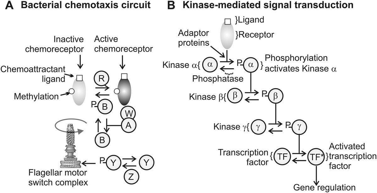 Figure 9.2 Biological circuits. (a) Equivalent protein circuit for bacterial chemotaxis, A, B, W, Y, and Z are chemotaxis proteins CheA, CheB, CheW, CheY, and CheZ, respectively, with P indicating phosphorylation. (b) A common method of cellular signal transduction following detection of a ligand by a receptor, typically in the cell membrane, involves a cascade of serial phosphorylation steps of tyrosine kinase enzymes (depicted here by example with some genetic kinases α, β, and γ), which ultimately activates a transcription factor, which in turn can then result in regulation of a specific gene or set of genes.