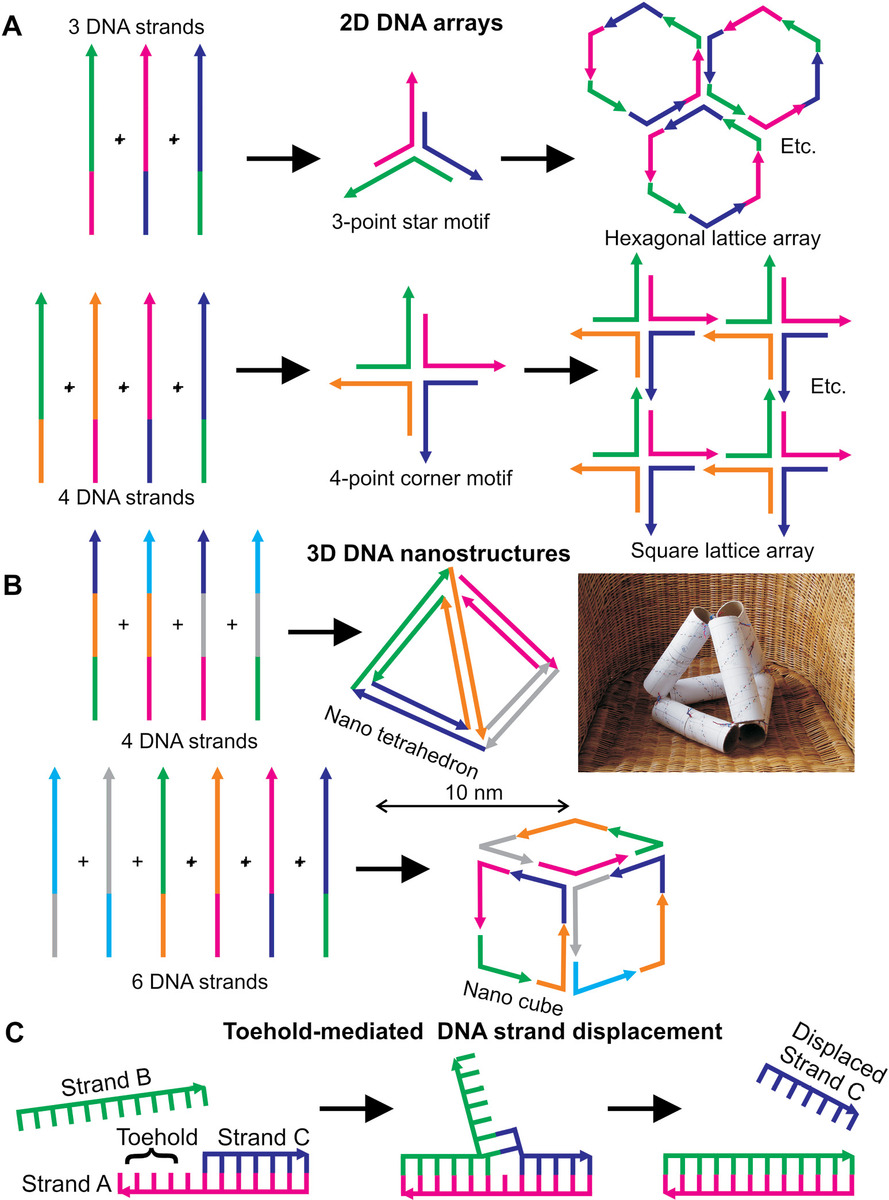 Figure 9.3 DNA origami. (a) Three or four strands of DNA can be designed to have complementary segments as indicated, giving rise to self-assembled 2D arrays with either hexagonal or square lattices, respectively. (b) Using more complex design involving more complementary DNA segments, 3D DNA nanostructures can be generated, such as tetrahedrons and cubes shown here (though more generally nontrivial geometrical shapes objects can also be generated). The original DNA tetrahedron design was conceived using six toilet roll tubes, some paper, and some colored bits of bendy wire (right panel: Courtesy of Richard Berry, University of Oxford, Oxford, UK). (c) Artificial DNA molecular motors all use toehold-mediated strand displacement, for example, strands A and B here are complementary, and so the addition of strand B to the solution will displace strand C from the A–C DNA nanostructure indicated.